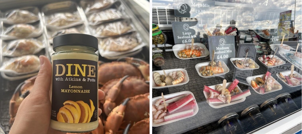 Harbourside Outlets features a wide variety of fresh seafood. You can enjoy prawns, cockles, whelks, mussels, and even locally caught crab and lobsters. Perfect for seafood lovers!